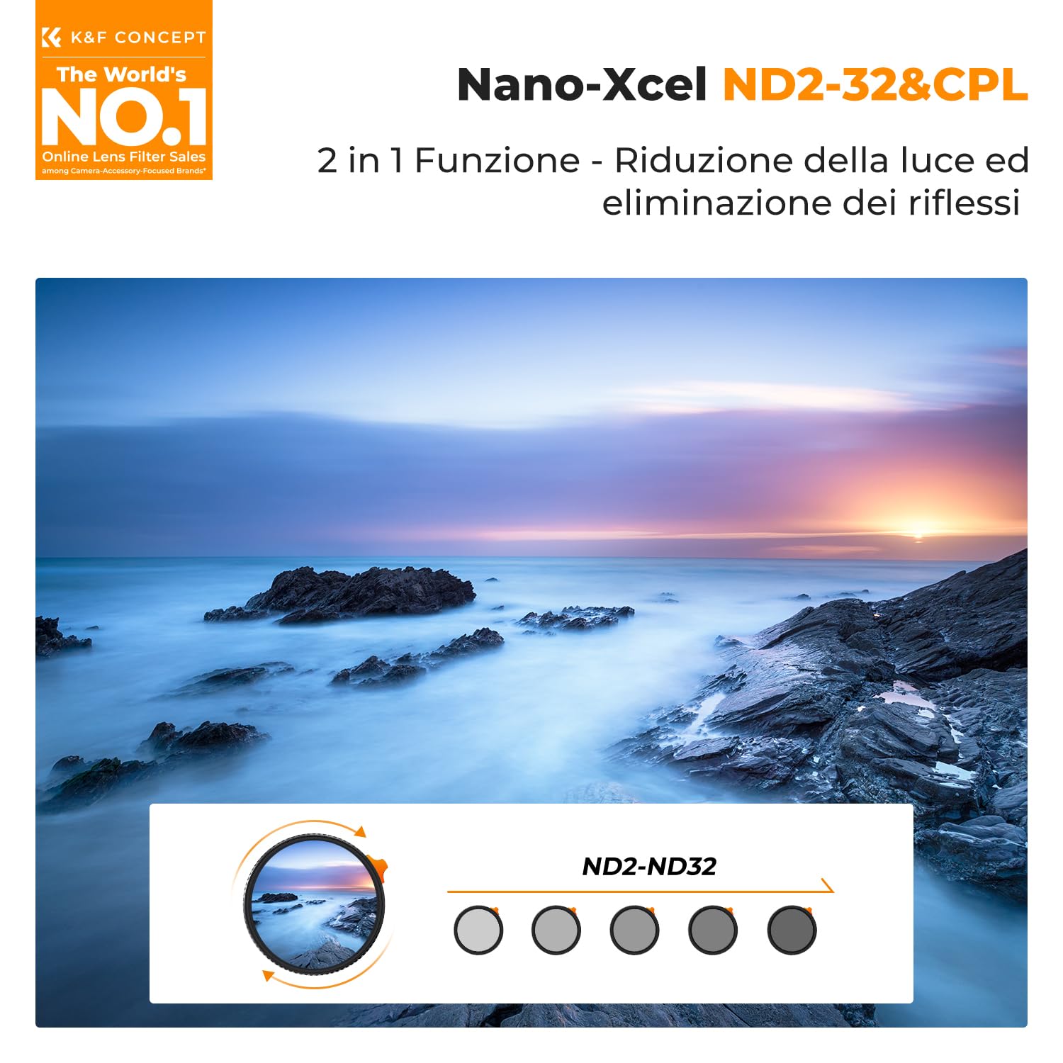 K&F CONCEPT Nano-Xcel 95MM Filtro ND2-32 & CPL, 2 In 1 Filter Polarizzatore Circolare & Densità Neutra Variabile NO X Spot con Custodia in Vetro Ottico con Rivestimento Nano a 28 Strati
