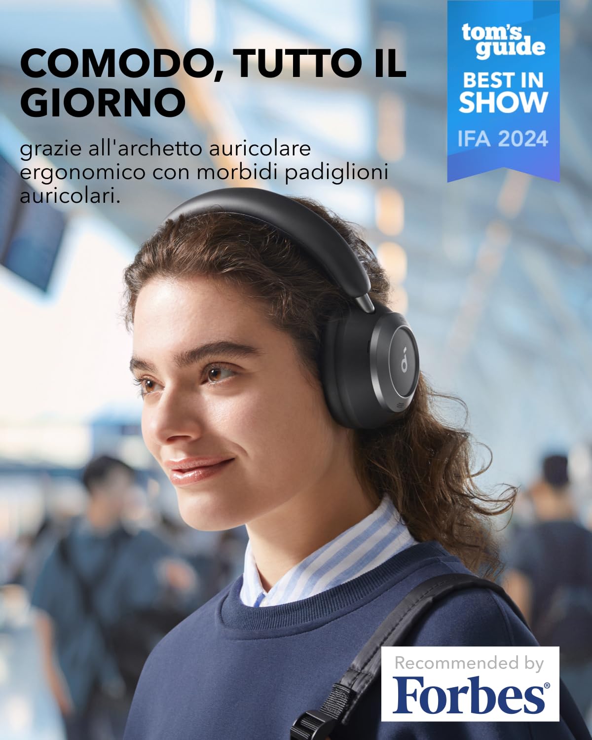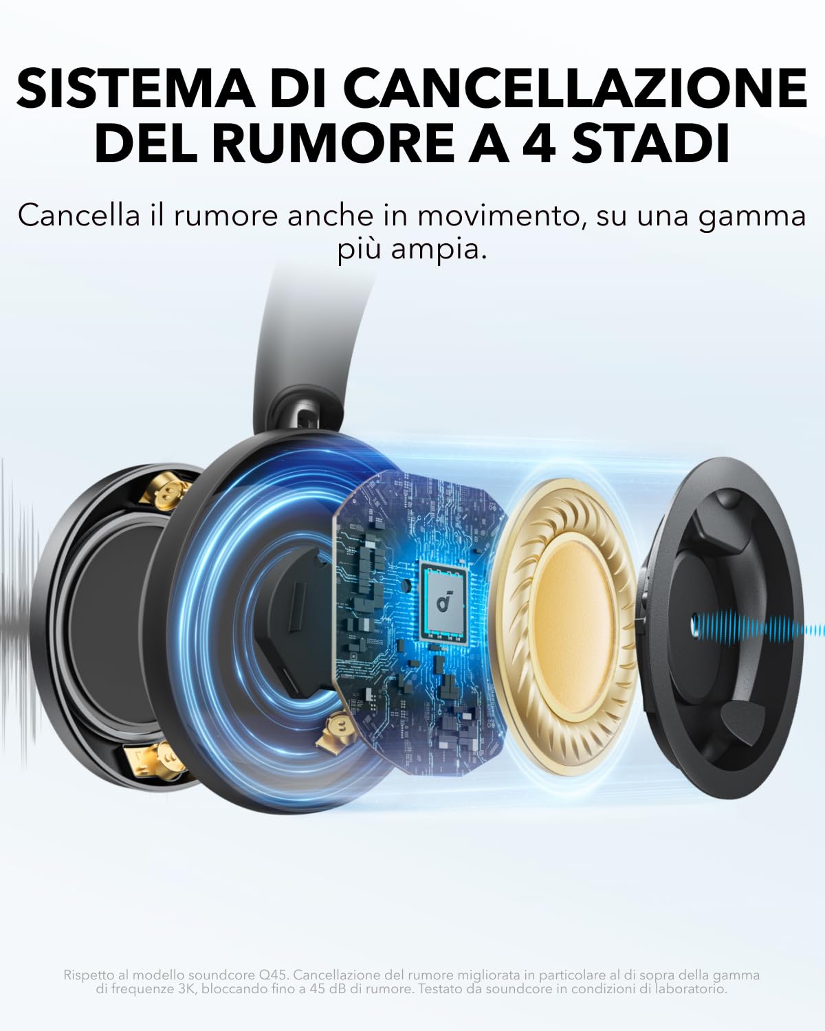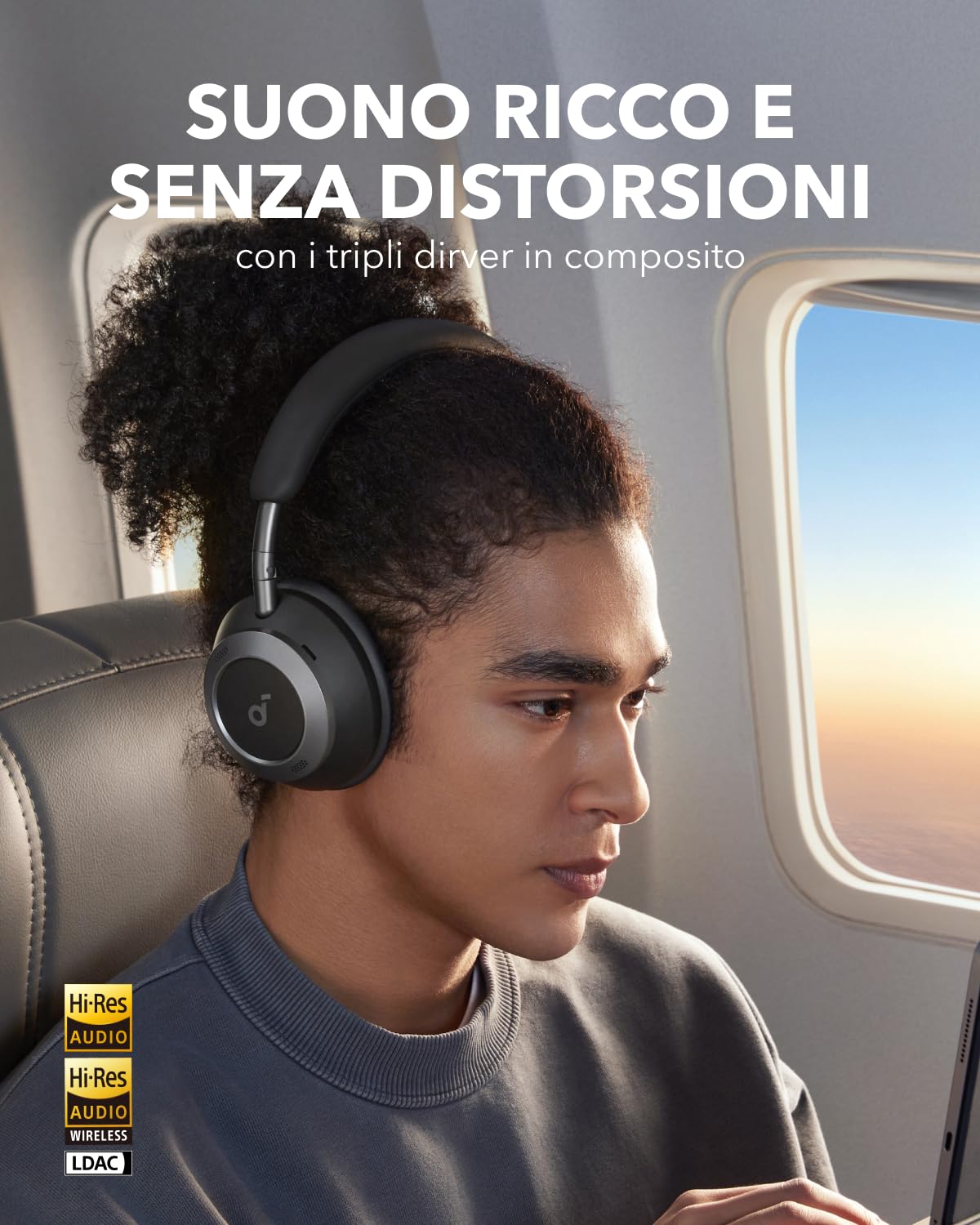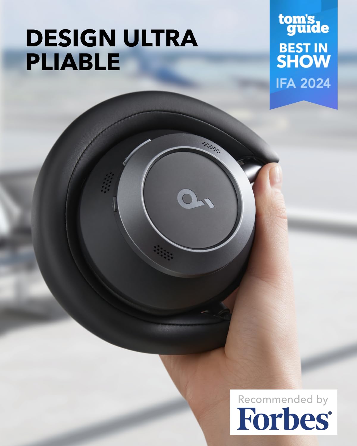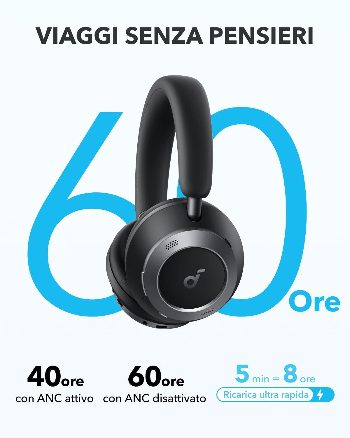 soundcore Space One Pro di Anker, cuffie adattive a cancellazione del rumore attiva, 6 microfoni, design pieghevole, ricarica ultraveloce, 60 ore audio ad alta risoluzione con LDAC, vestibilità comoda
