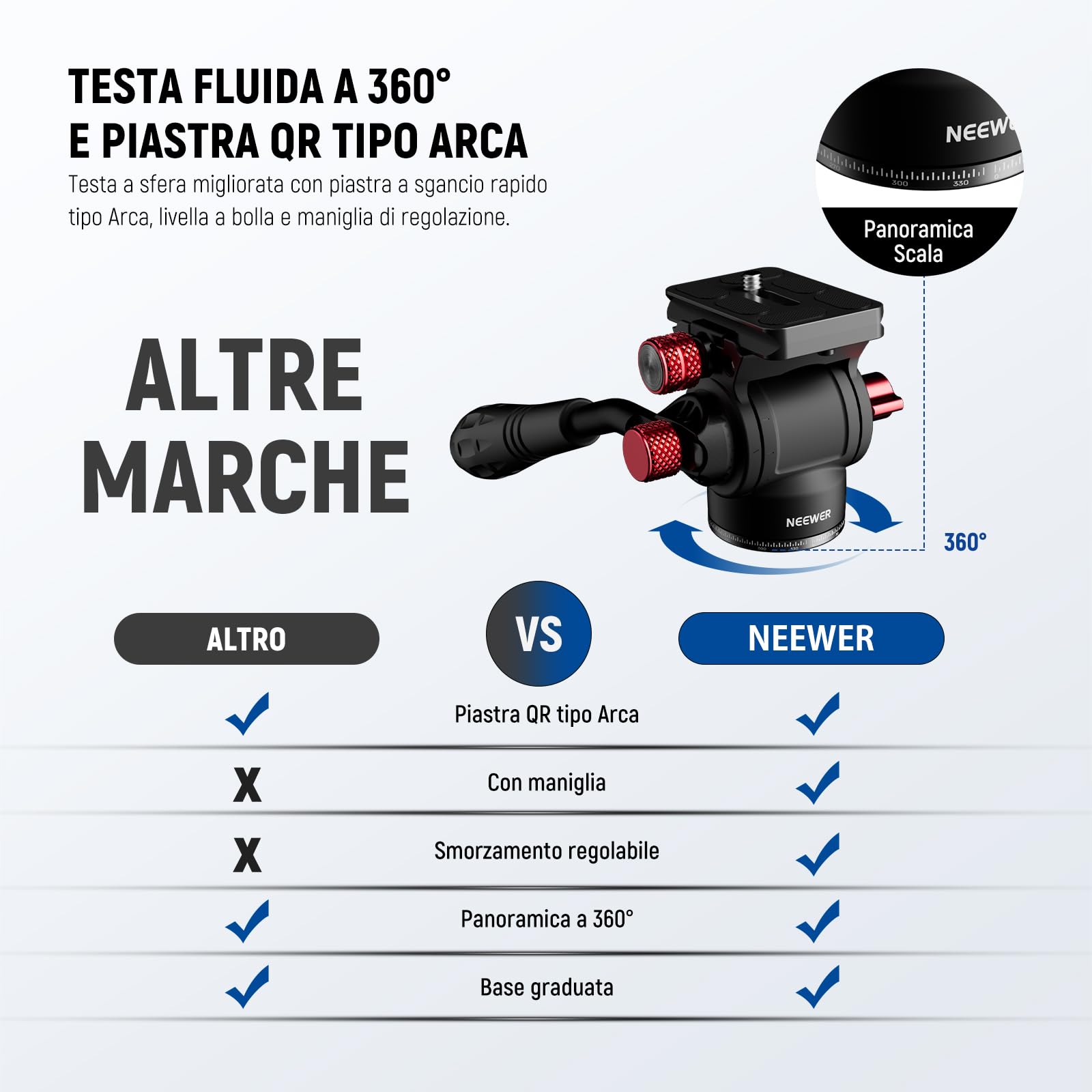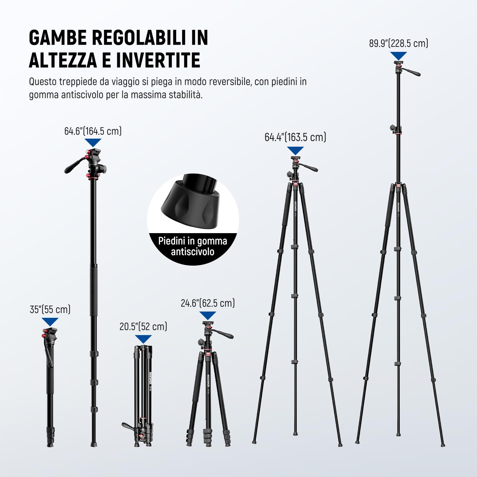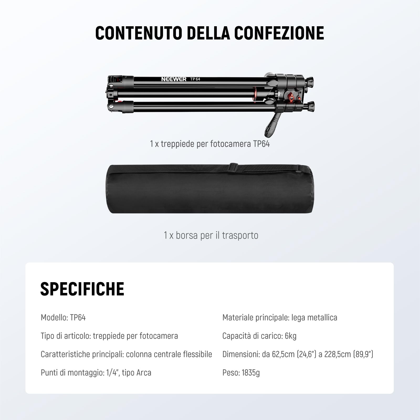 NEEWER Monopiede Treppiede Fotocamera Orizzontale Overhead con Testa Fluida e Colonna Centrale Flessibile, 90” DSLR Video Tripod da Viaggio in Metallo, Piastra QR Arca e Gambe Invertite, Max 6kg, TP64